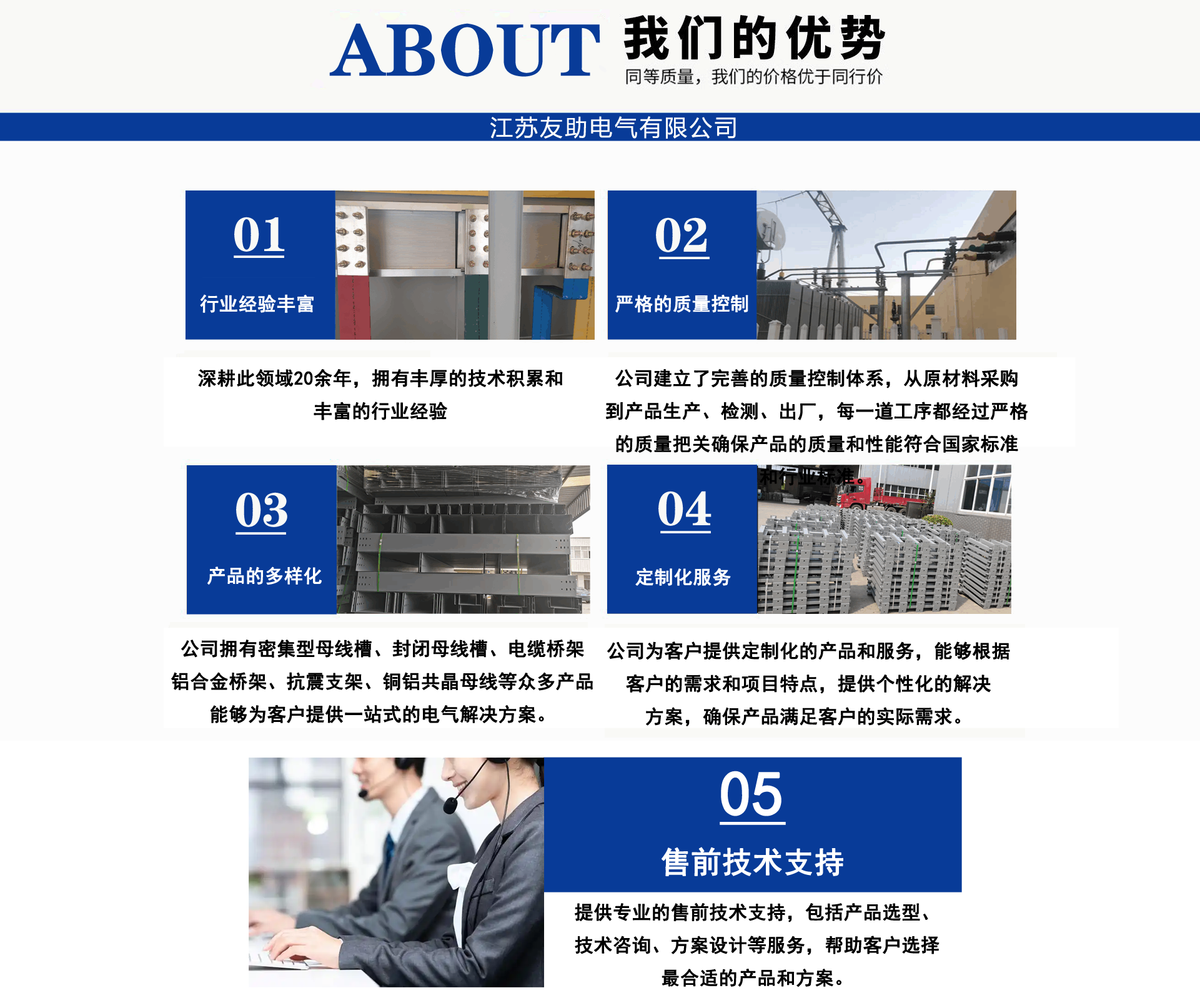 江蘇友助電氣有限公司地處中國工程電氣生產基地-一江蘇省揚中市。經營范圍:電纜橋架,母線槽(橋),管型母線,銅軟連接(伸縮節),高低壓開關柜,配電箱,抗震支架產品系列?!」咀谥迹嚎蛻糁辽?。已成功為江蘇二十屆省運會會場-泰州體育館,南京寶龍商業綜合體,張家口百兆瓦風電場,濟源市婦幼醫院,威海市未來科技園,湖北皇恩燁新材料科技有限公司,南京中央路小學,南通中天大酒店,新疆新安特鋼有限公司,河北省送變電有限公司,南京南微醫學研發基地等多項工程配套服務,我們愿與您精誠合作,互利共贏!公司技術人員深耕橋架,母線領域30年,為您提供橋架,母線槽疑難問題解決方案。母線槽不論每相是單排,雙排,三根排重疊,不管有多少個水平彎、垂直彎,轉接排在發貨前預裝一遍,確保尺寸無誤。到現場直接擰螺絲,效率高,橫平豎直,規規矩矩,符合標準,供電局,業主,監理,驗收易通過。供貨周期3-7天。為了讓尊貴客戶您,設備安全通電,高枕無憂。我們提供如下售前售中售后服務: 售前:免費技術支持,咨詢。 售中:免費現場精確測繪、設計?!∈酆?安裝服務,免費指導?!≠|量是生命,客戶是源泉。承諾客戶的,一定全力做到。讓我們一起進步!...